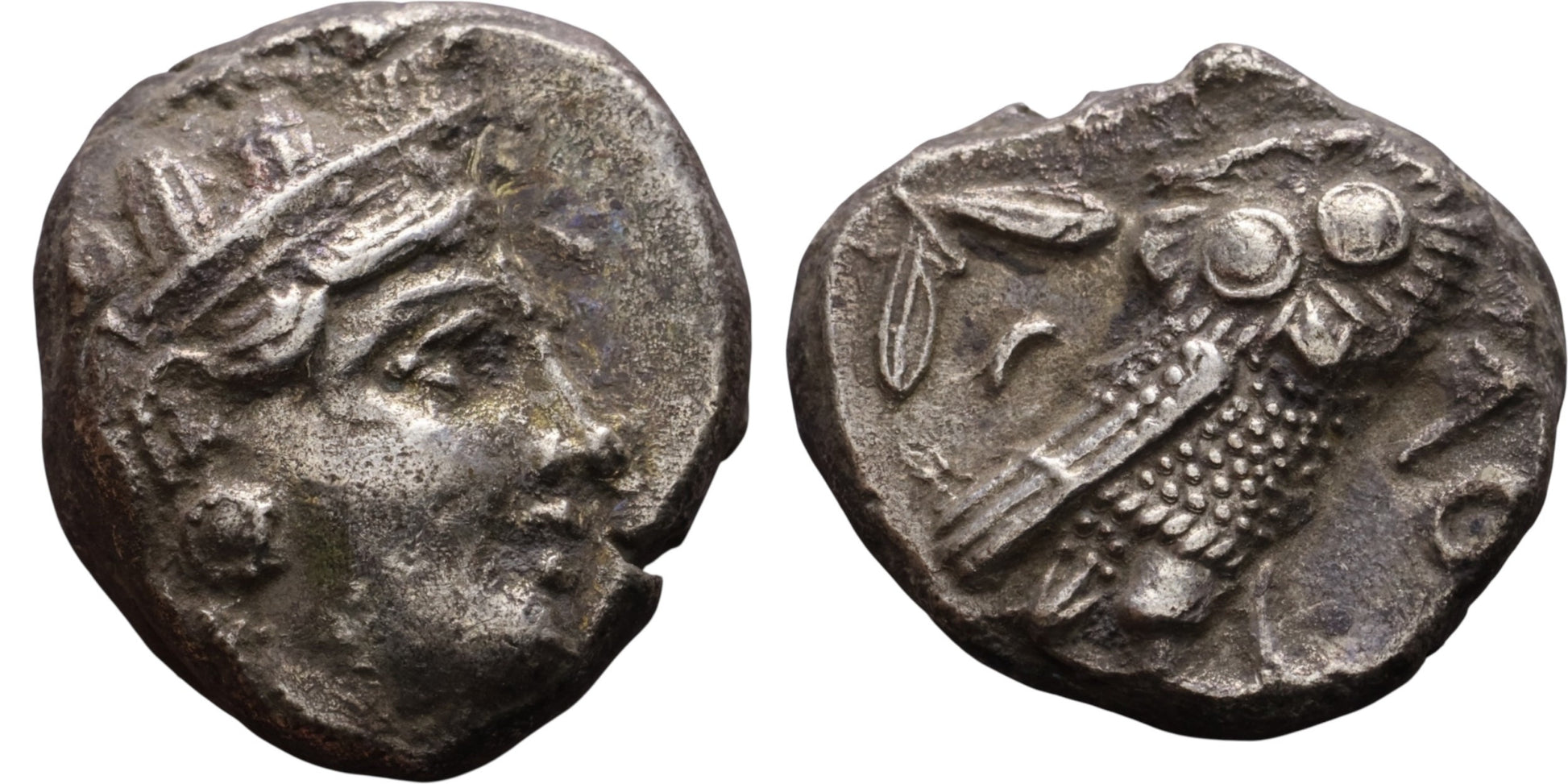 Obverse: Head of Athena right, wearing earring, necklace, and crested Attic helmet decorated with three olive leaves over visor and a spiral palmette on the bowl.