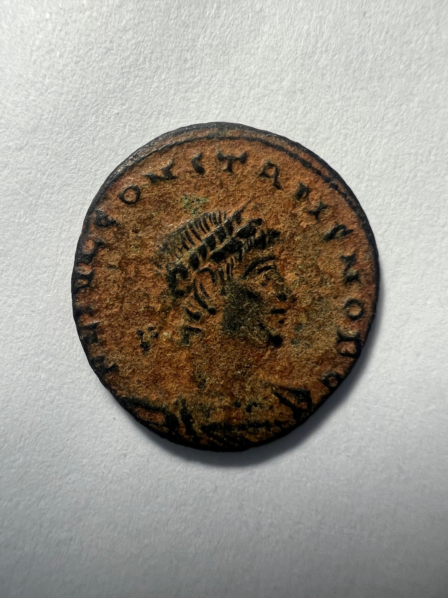 Nicely preserved Roman coin from the Constantinian dynasty in reversible black/white background display case. Case measurement: 8.5 x 6.5 cm.