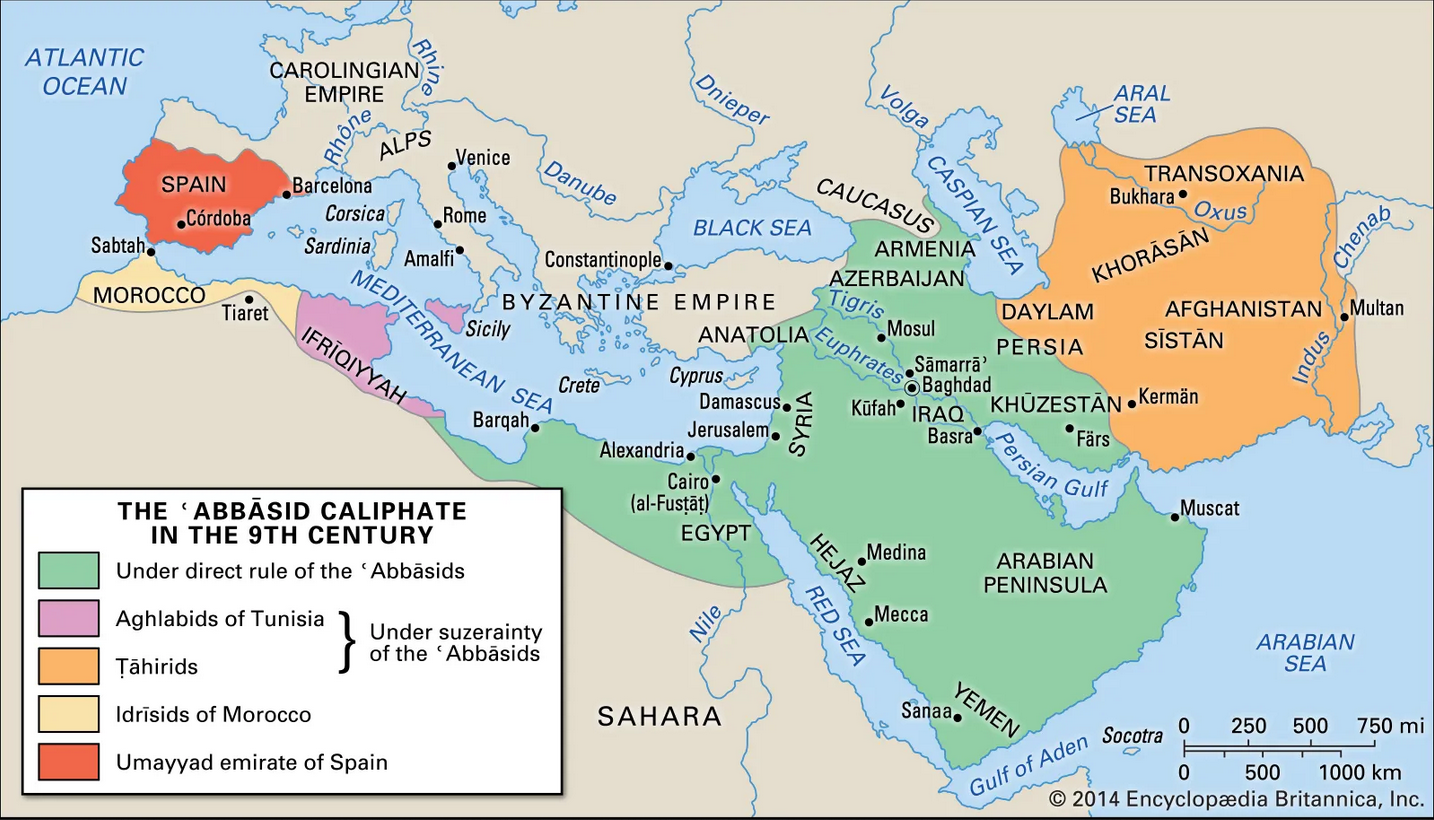 The Abbasid Caliphate was the third Islamic caliphate to succeed the Islamic prophet Muhammad (ca. 750-800 CE). It extended from North Africa, through Egypt and Saudi Arabia, to modern-day Iraq. The Abbasid dynasty descended from Muhammad's youngest uncle, Abbas ibn Abd al-Muttalib, and for most of Caliphate's existence the dynasty ruled from Baghdad.