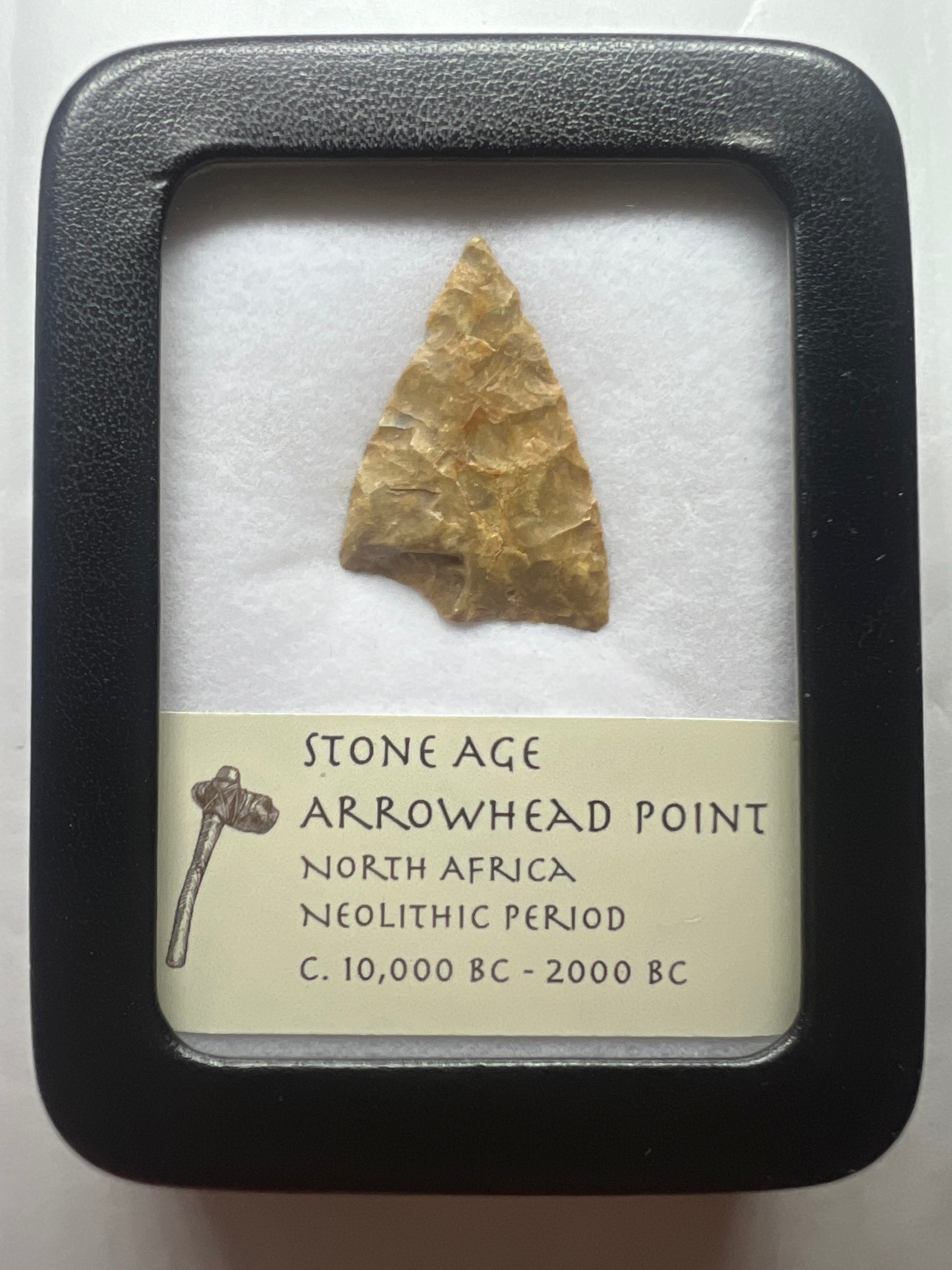 You are buying the following Neolithic arrowhead set in a display case as pictured. This good quality Neolithic arrowhead exhibit amazing flaking and patina.